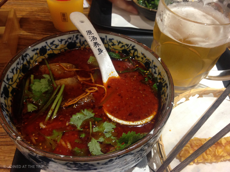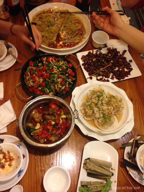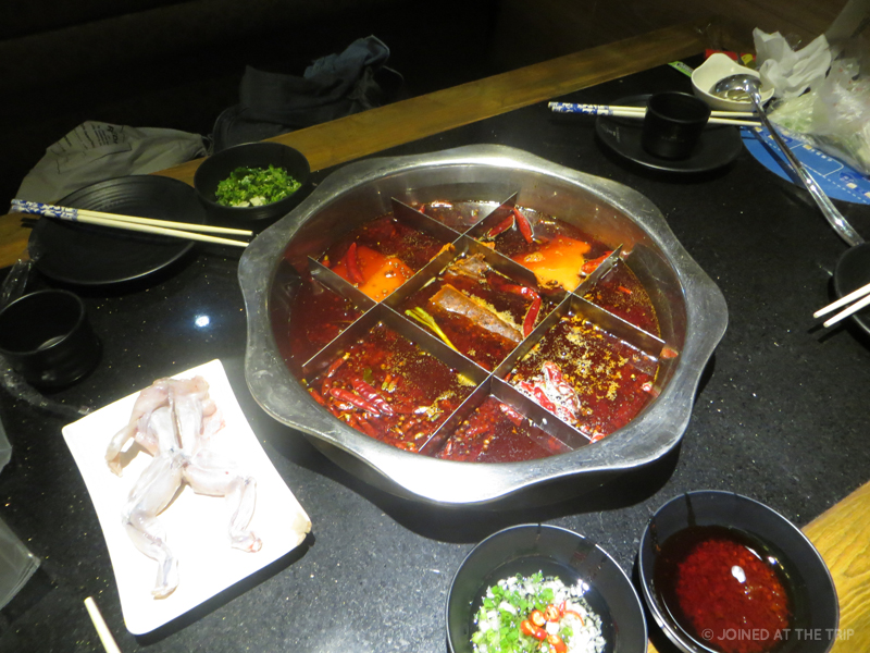 One evening we went for a hotpot. The concept is simple, a pot of simmering broth is placed on a burner in the middle of the table. You then order plates of meat, seafood, and vegetables, all prepared and ready to be cooked in the broth. You can choose the spiciness of the broth and make up your own dipping sauces. Hotpots in China are known for some pretty unusual ingredients but we kept it quite ‘normal’ – although we did try bull frog and cow stomach!